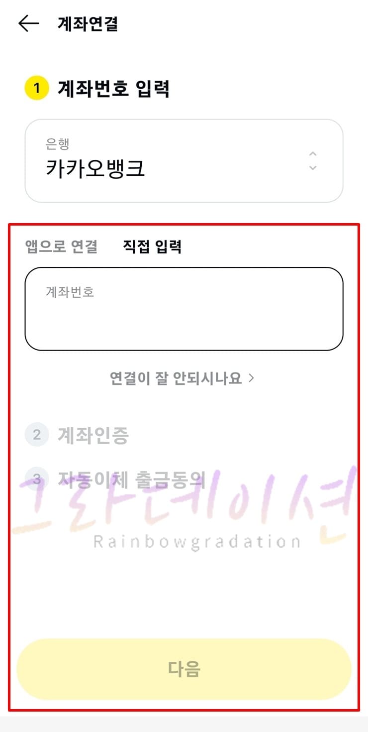 8. '앱으로 연결'과 '직접 입력' 중 원하는 연결 방식으로 진행합니다. 필자는 앱으로 연결하겠습니다. 카카오뱅크 앱이 설치되어 있다면 앱으로 연결 방식이 더욱 편리합니다.