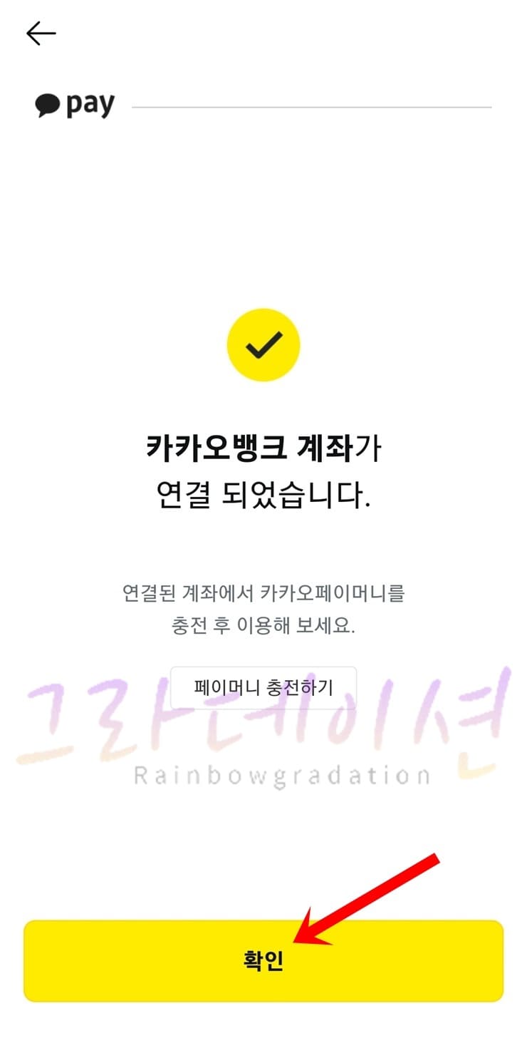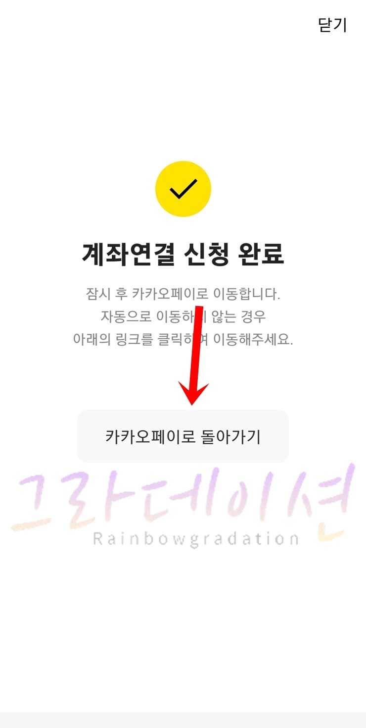 10. 계좌연결 신청 완료 화면에서 '카카오페이로 돌아가기' 버튼을 클릭합니다. 그러면 카카오페이에 카카오뱅크 계좌가 성공적으로 연결되었습니다.