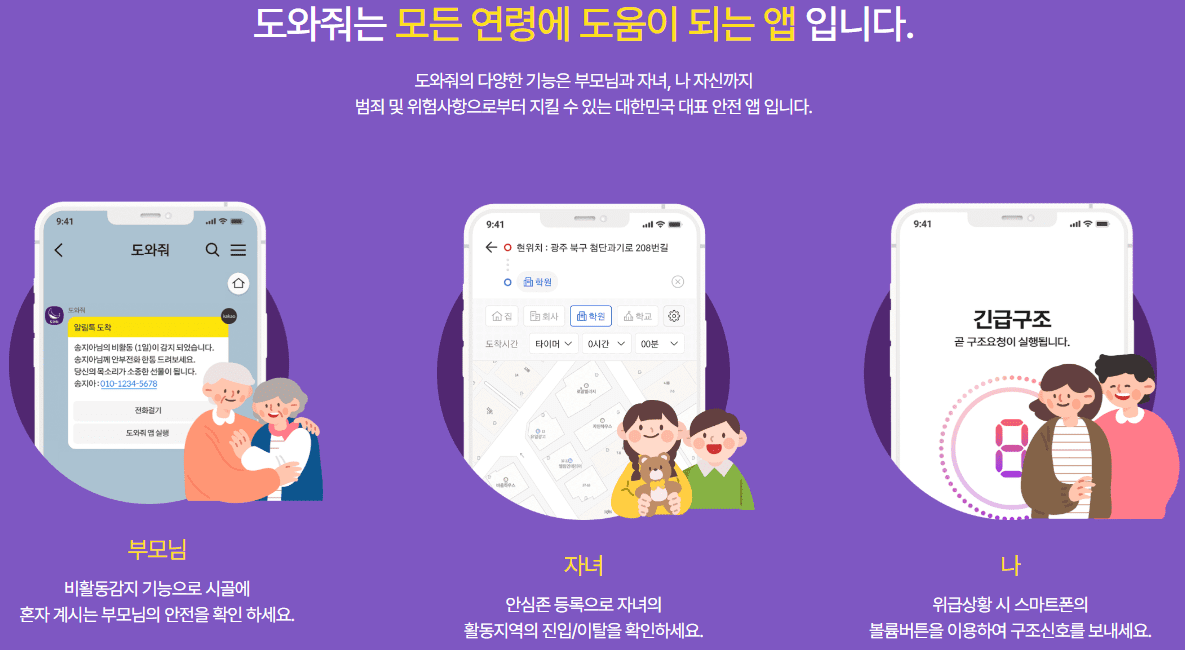도와줘는 소중한 자녀(피보호자)의 위치추적, 위치확인, 안심귀가, 구조요청 등을 할 수 있는 대한민국 안전지킴이 무료 애플리케이션 입니다.