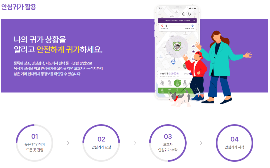 • 안심귀가 : 등록된 보호자에게 안심귀가 요청을 하면 보호자로 부터 자신의 귀가상황을 실시간으로 모니터링을 받을 수 있어서 위급상황시 빠른 대처가 가능합니다.