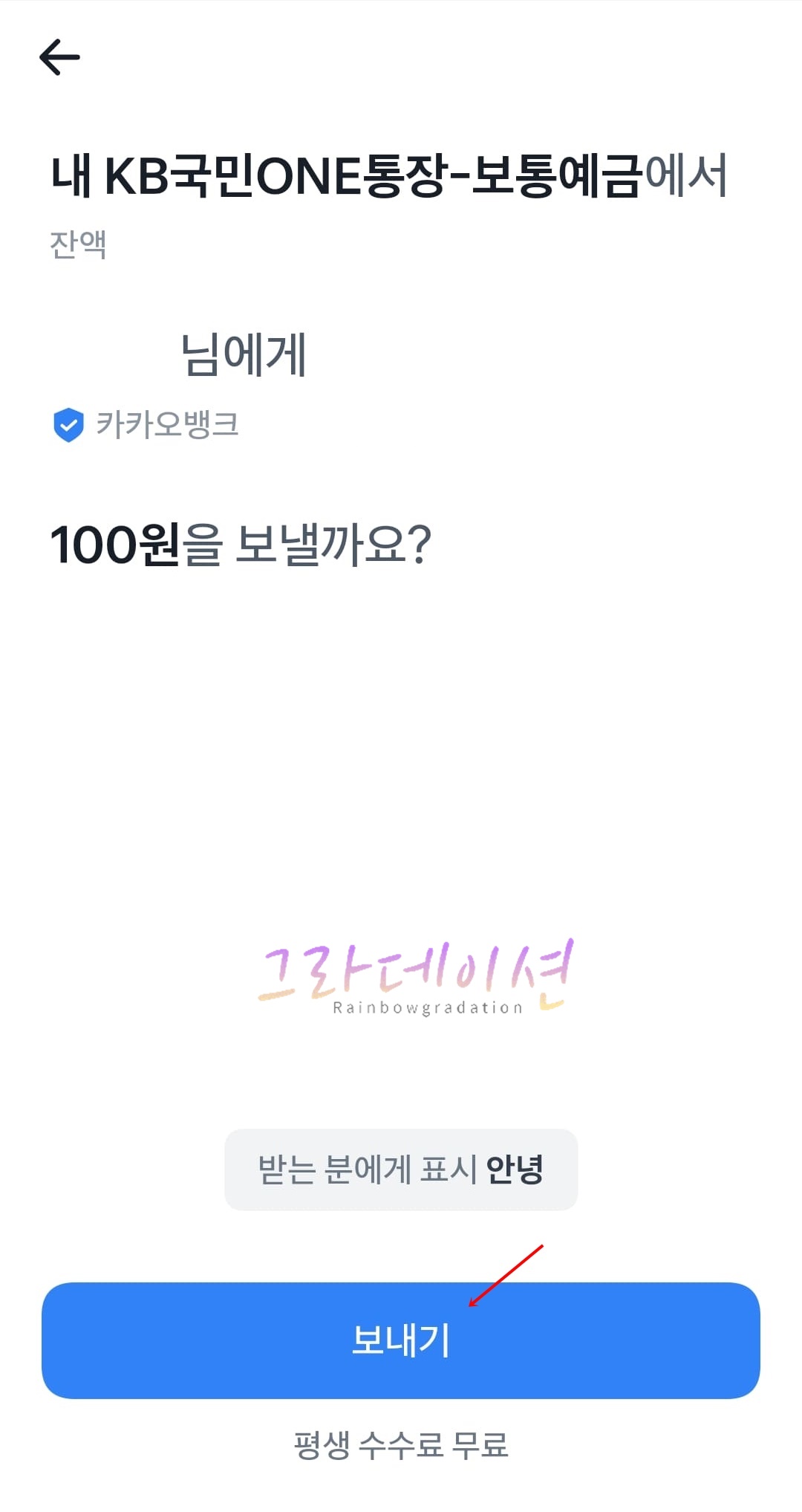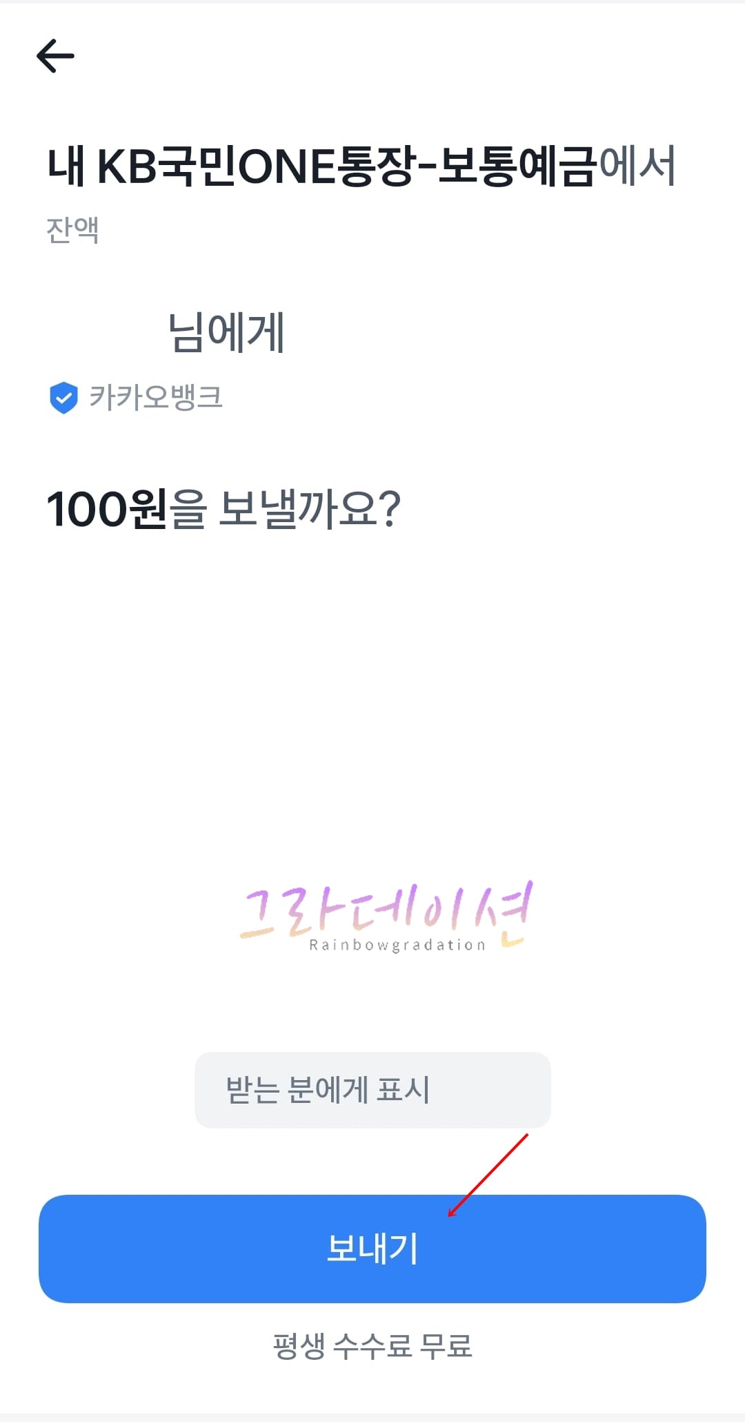 '보내기' 버튼을 클릭하시면 상대방에게 송금이 보내집니다. 만약에 입금자명을 본인 이름이 아닌, 다른 이름명으로 바꾸고 싶으신 분들은 아래 「입금자명 변경 방법」을 진행하시면 됩니다.
