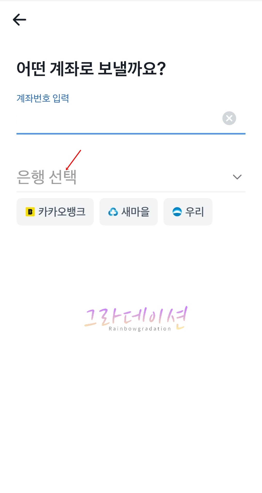 '은행 선택 항목'을 클릭한 후, 상대방의 은행을 선택합니다.