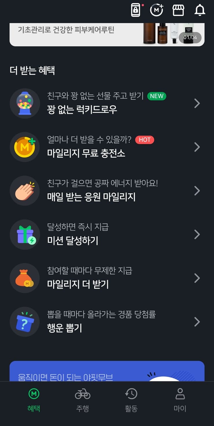👉 운동도하고~ 마일리지도 모으고~ 기프티콘도 사고~ 덕분에 소소한 재미를 느끼며 사용하고 있습니다! 쌓인 에너지는 하나씩 클릭하여 마일리지로 적립해야 하는게 조금 귀찮지만 그래도 부스터 기능이 있어서 금방 되네요.
