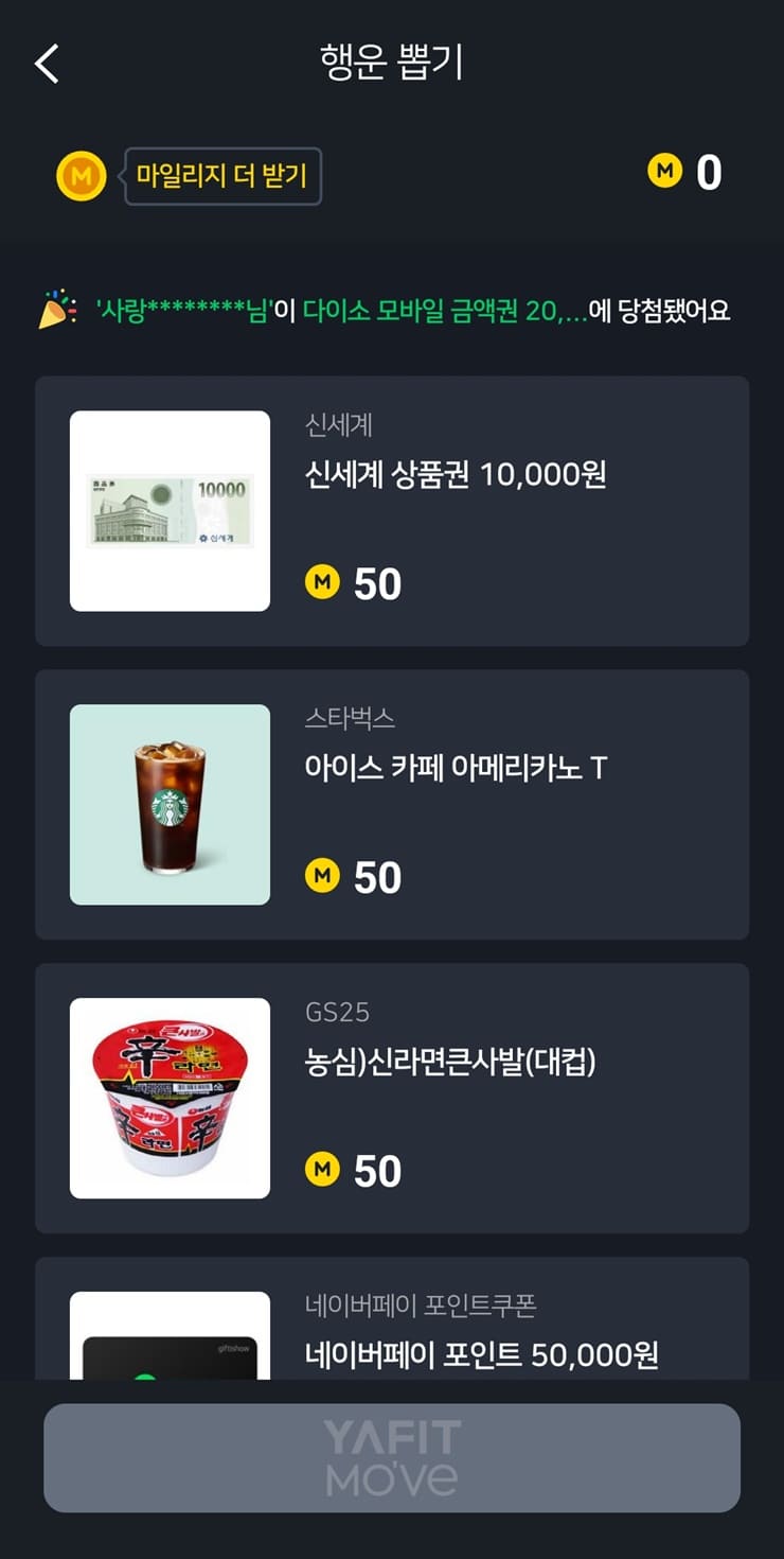 마일리지는 야핏무브에서 사용할 수 있는 재화입니다. 마일리지로 마일리지 샵과 행운 뽑기에서 원하는 상품을 구매할 수 있습니다.