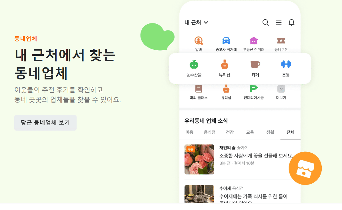 내 근처 가게 정보가 궁금할 때 손쉽게 찾을 수 있어요. 우리 동네 이웃들의 추천 후기를 확인하고 동네 곳곳의 가게들을 찾아보고 이용할 수 있어요.