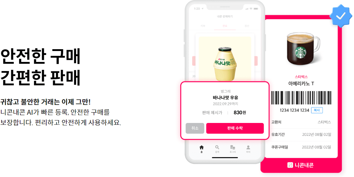 👉 항상 중고거래 사이트에서 기프티콘 팔았었는데 직접 파는게 생각보다 신경 쓸게 많더라고요. 니콘내콘은 앱으로 간단하게 기프티콘 등록하고 편하게 팔 수 있어 신경 쓸 일이 많이 줄었어요. 팔고 며칠 내로 수수료 없이 출금 가능해서 좋아요. 요즘 정말 잘 사용하고 있는 기프티콘 판매 앱이에요. 추천합니다.