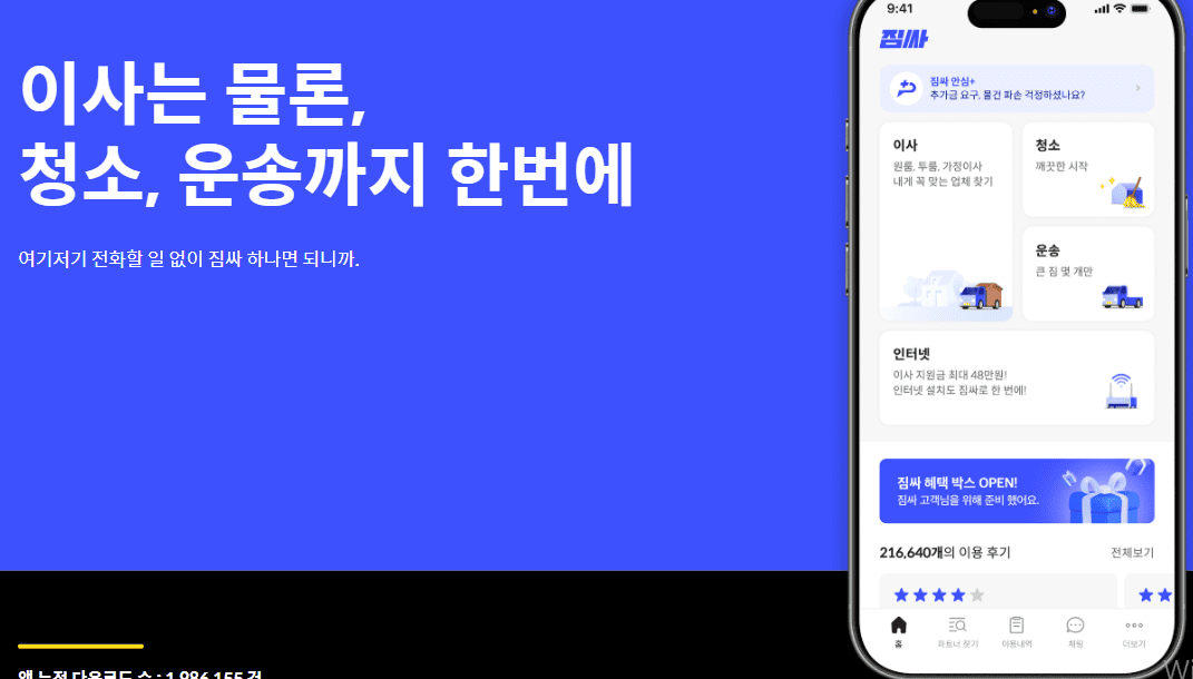 안녕하세요. 어플을 소개하는 그라데이션's입니다. 이번 시간에는 짐싸에 대해서 알아보는 시간을 갖겠습니다. 짐싸는 이사, 청소, 운송, 인터넷 서비스까지 한 번에 견적 비교 및 예약이 가능한 종합 생활 플랫폼입니다. 이사를 준비하면서 청소까지 한 번에 해결할 수 있어 매우 유용하고 편리하게 사용할 수 있는데요. 출발지와 도착지, 이사 날짜를 입력하고 보유한 이삿짐 정보를 간단히 입력하면 해당 일정에 가능한 업체들이 각각의 견적을 제시하는 방식입니다. 이제는 일일이 전화를 걸거나 방문 상담을 받을 필요 없이, 스마트폰으로 짐싸 앱을 설치한 후 출발지와 도착지 주소, 가구 및 짐 목록만 입력하면 간편하게 견적을 받아볼 수 있습니다. 최대 9개의 업체로부터 견적을 받을 수 있으며, 가격은 물론 리뷰와 평점까지 한눈에 비교할 수 있어 신중한 선택이 가능합니다. 현재까지 짐싸 누적 서비스 요청 수는 2,749,389건에 달하며 이용자 만족도는 4.9점으로 높은 평가를 받고 있습니다. 지금부터 짐싸에 관련된 자주 묻는 질문을 알려드리니 참고해주시기 바랍니다.