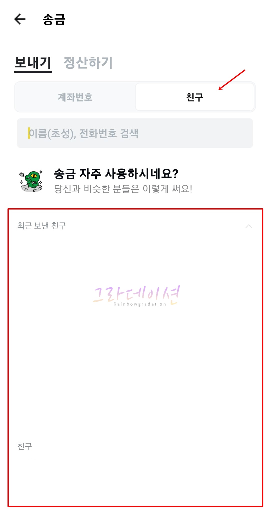 ① '친구' 탭을 클릭한 후, 카카오톡 친구 항목 중에서 '송금을 보내고 싶은 친구'를 선택합니다. 그리고 아래 <동일한 송금 방법>을 참고하시기 바랍니다.