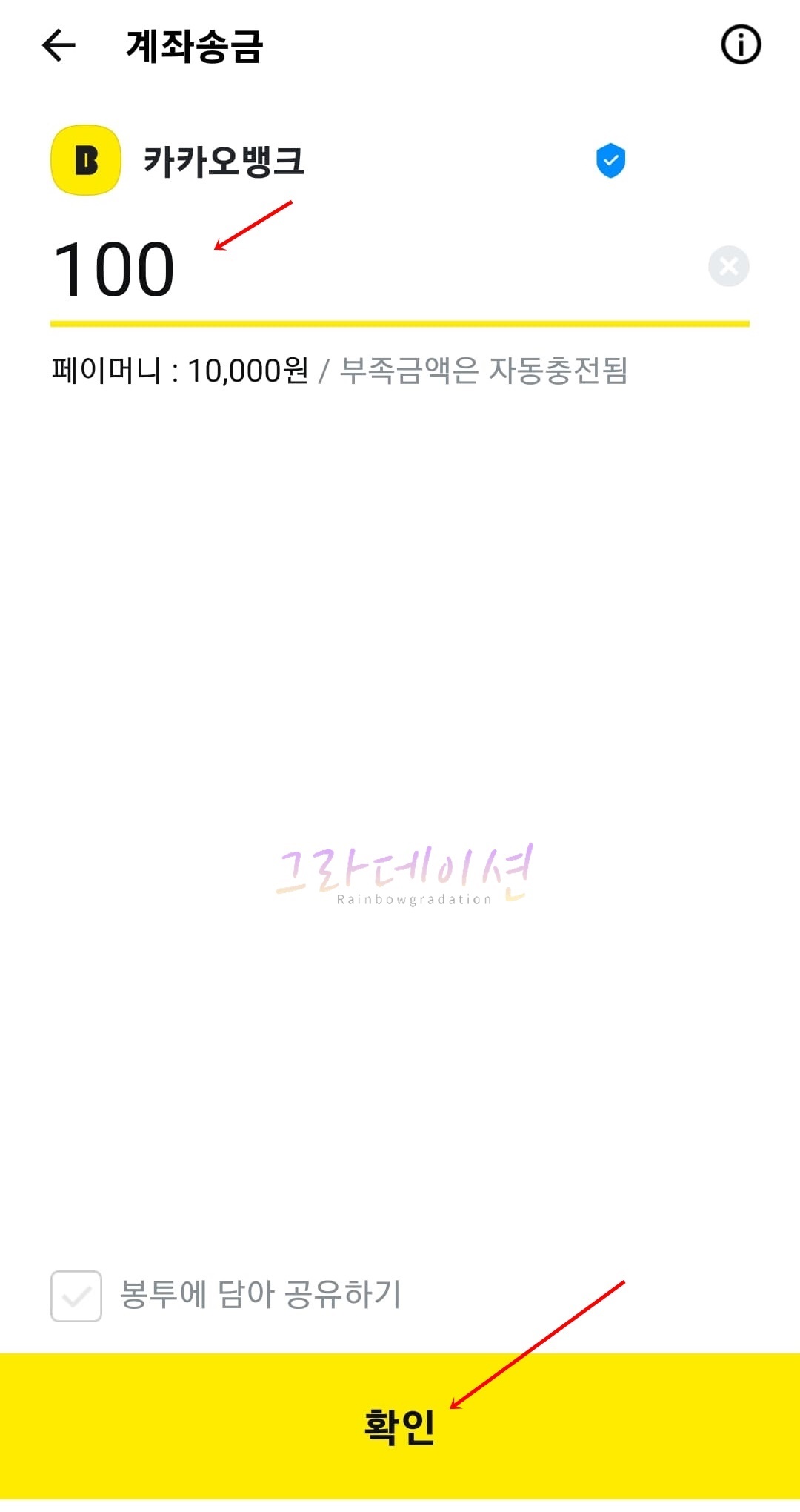 3. '송금 금액'을 입력한 후, '확인' 버튼을 클릭합니다. 만약에 봉투에 담아서 송금을 하고 싶다면 '봉투에 담아 공유하기' 버튼을 클릭합니다. 봉투 스타일은 축결혼, 내마음, 정산해요, 밥값이요, 고마워요, 사랑해요, 부자되세요, 감사해요, 축하해요, 부의 10개의 스타일이 있으며 '원하는 봉투'를 선택하시면 됩니다.