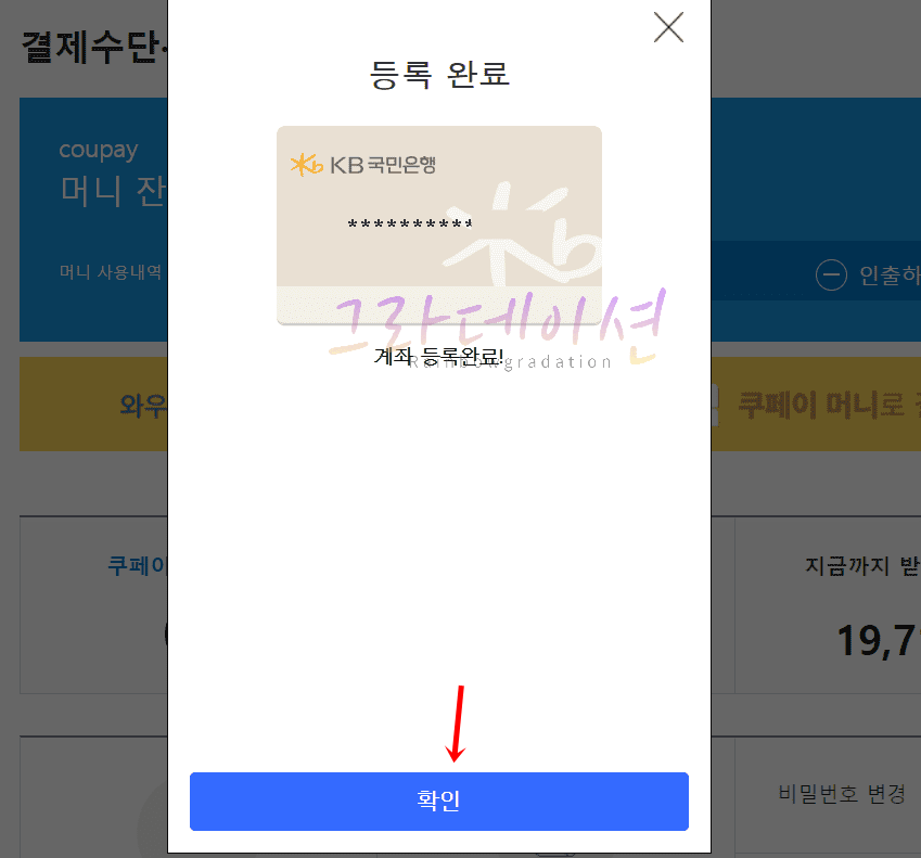 10. '확인'을 클릭하시면 쿠팡에 등록된 계좌 및 카드를 확인하실 수 있습니다.