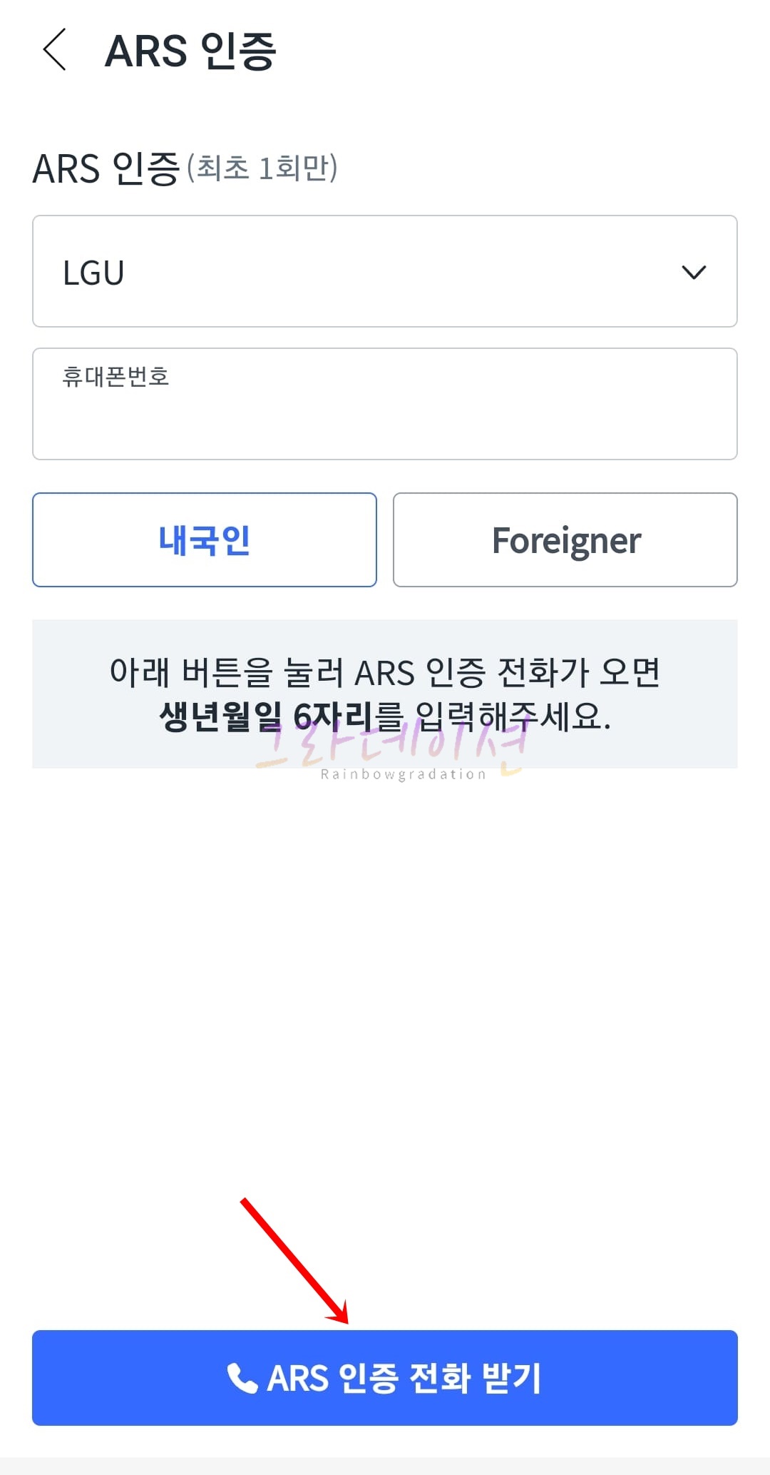 8. 두 번째 인증은 ARS 인증입니다. 본인의 휴대폰 번호가 일치한 지 확인한 후, 'ARS 인증 전화 받기' 버튼을 클릭합니다. 바로 「1833-5296」로 전화가 오며 수신을 받아서 '생년월일 6자리'를 입력하시면 됩니다.