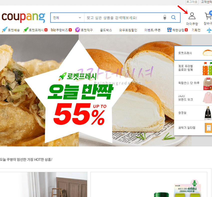 1. '쿠팡 사이트 (https://www.coupang.com)'를 실행한 후, 로그인을 합니다. 그리고 '마이쿠팡' 탭을 클릭합니다.