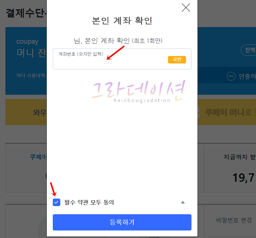 7. 해당 은행의 '계좌번호'를 입력한 후, '필수 약관 모두 동의' 버튼을 체크합니다.