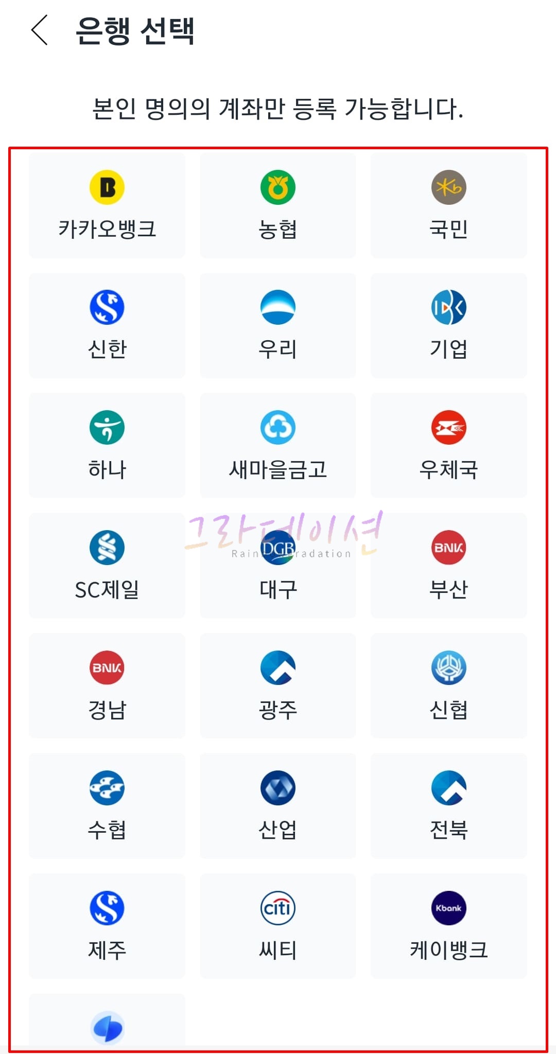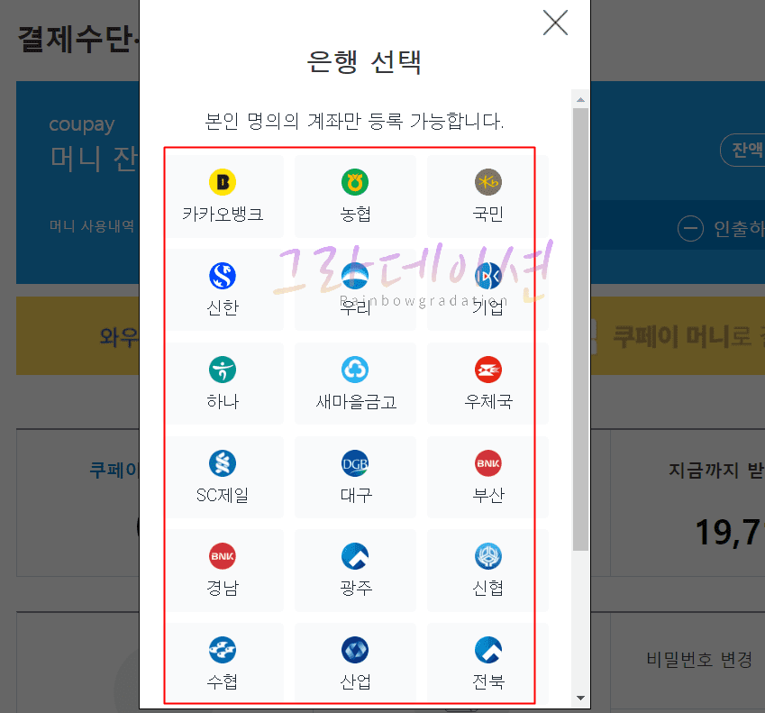 6. 쿠팡에 등록하고 싶은 '은행'을 선택합니다.