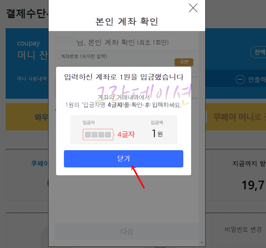 7. 첫 번째 인증은 계좌 확인 인증입니다. 방금 전에 등록하려는 계좌 인증 계좌로 1원이 입금되었으며 '해당 계좌 앱'을 실행하여 1원이 입금된 입금자 명을 확인합니다. 다시 쿠팡 화면으로 실행한 후, '입금자명 4글자'를 입력하고 '확인' 버튼을 클릭합니다.