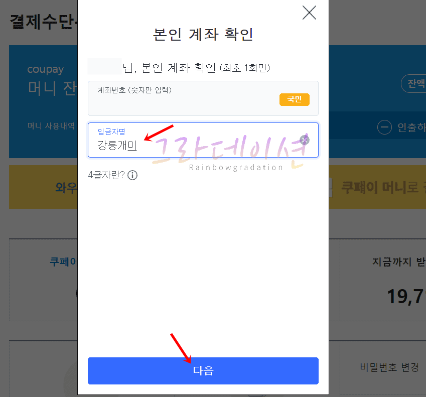 10. '해당 은행 앱'을 실행하여 1원이 입금된 입금자명을 확인합니다. 그리고 PC 쿠팡에서 확인했던 '입금자명 4글자'를 입력합니다. '다음' 버튼을 클릭합니다.