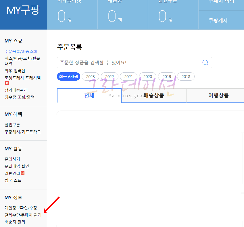 2. 왼쪽 탭에서 'MY 정보 > 결제수단 · 쿠페이 관리'를 클릭합니다.