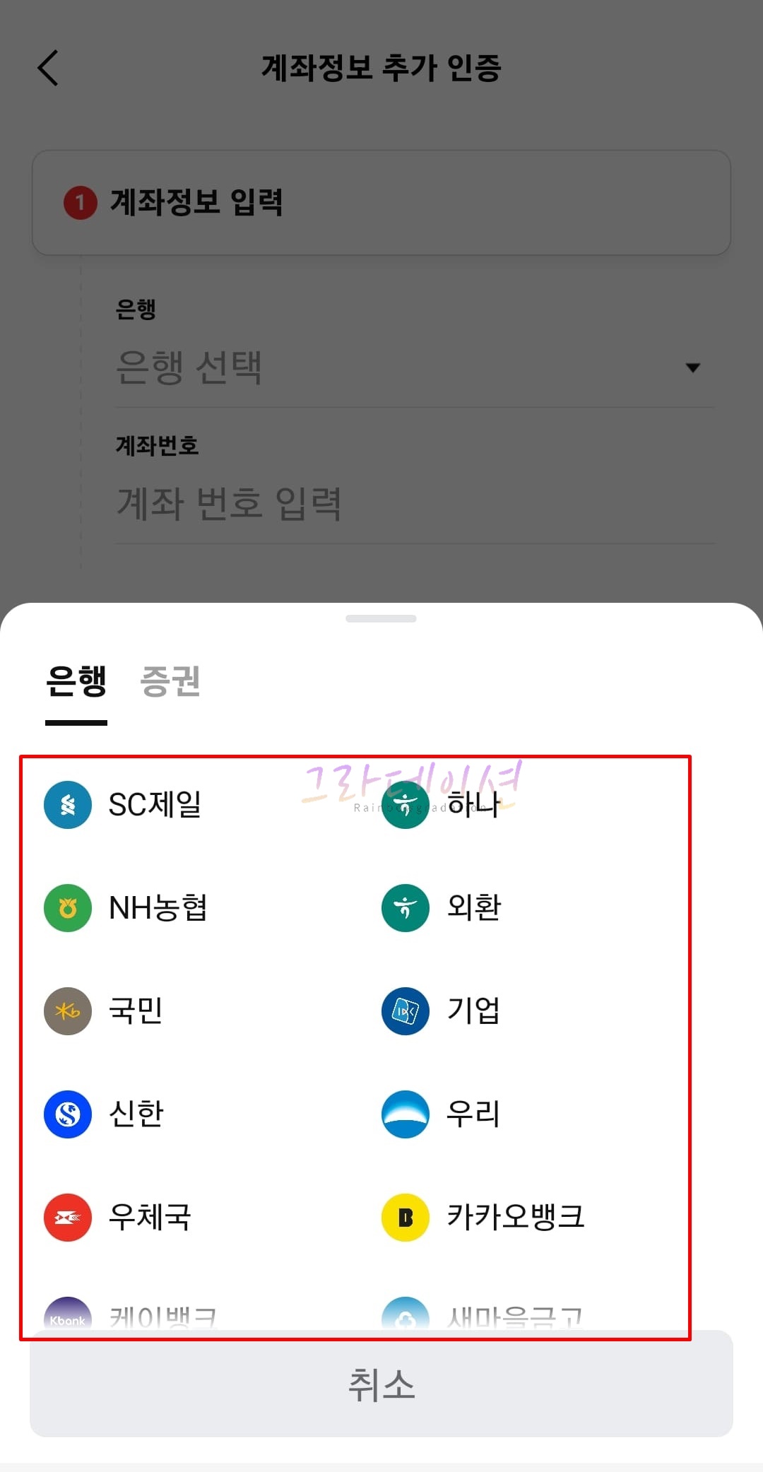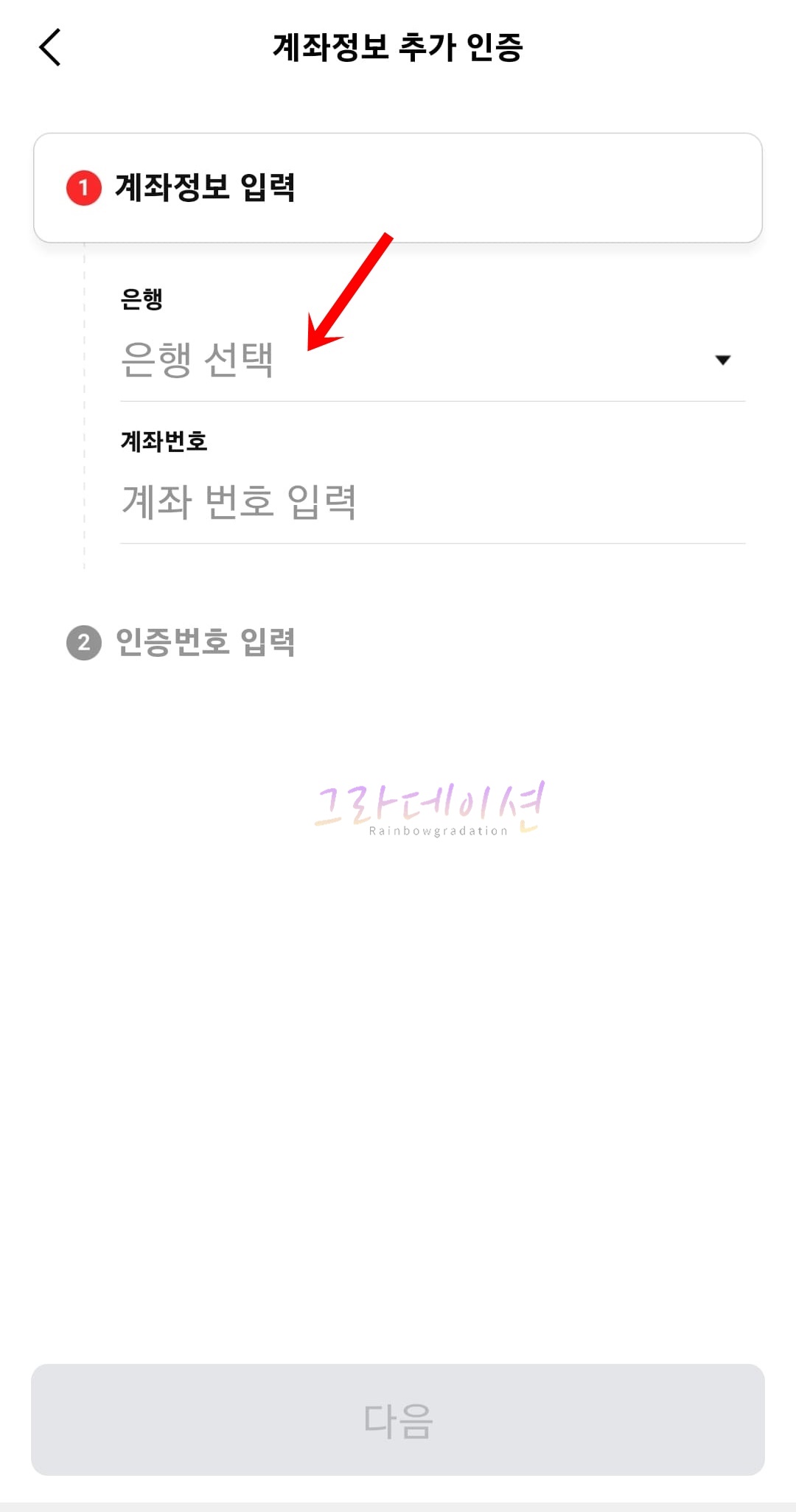 8. 본인 계좌를 인증하기 위해서 '은행 선택' 항목을 클릭합니다. 인증하고 싶은 '은행'을 선택합니다.