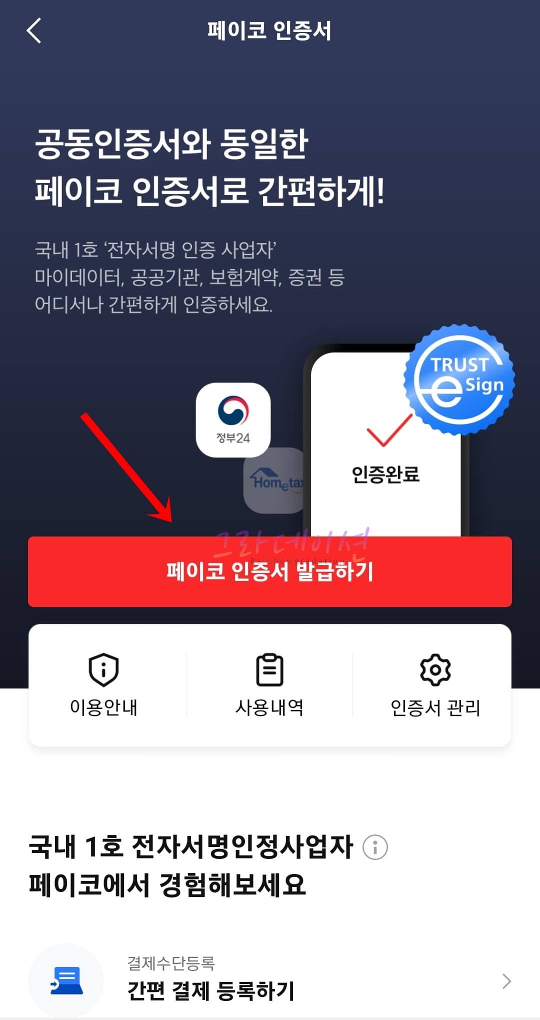 페이코 인증서 발급 방법