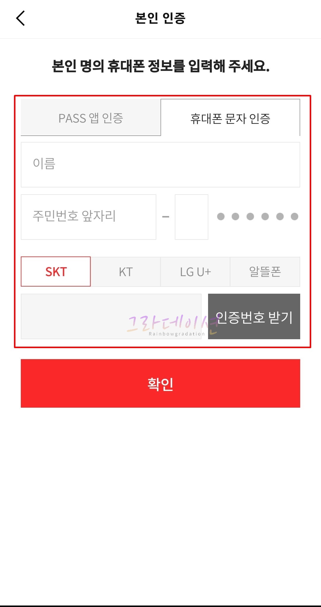 5. PASS 앱 인증과 휴대폰 문자 인증 중 원하는 '본인인증'을 합니다. PASS 앱 인증 경우, PASS 앱 가입 및 설치가 필요합니다. 필자는 휴대폰 문자 인증으로 진행해 보겠습니다. 본인의 이름과 주민번호 앞자리, 휴대폰 번호를 모두 '입력' 합니다.