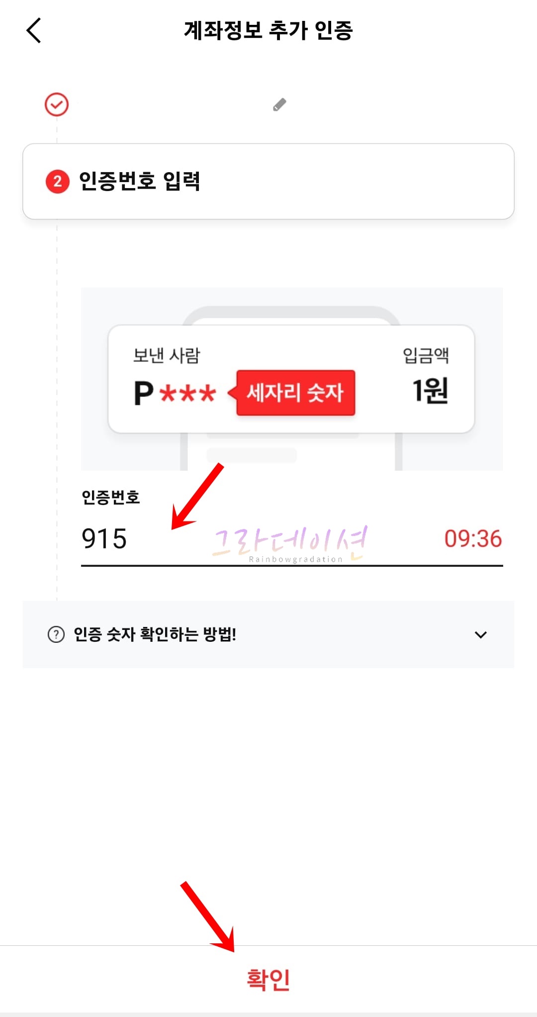 10. 해당 '은행 앱'을 실행하여 1원으로 입금된 P***(숫자 3자리)를 확인합니다. 그리고 다시 페이코 화면으로 이동하여 인증번호에 '세자리 숫자'를 입력합니다.