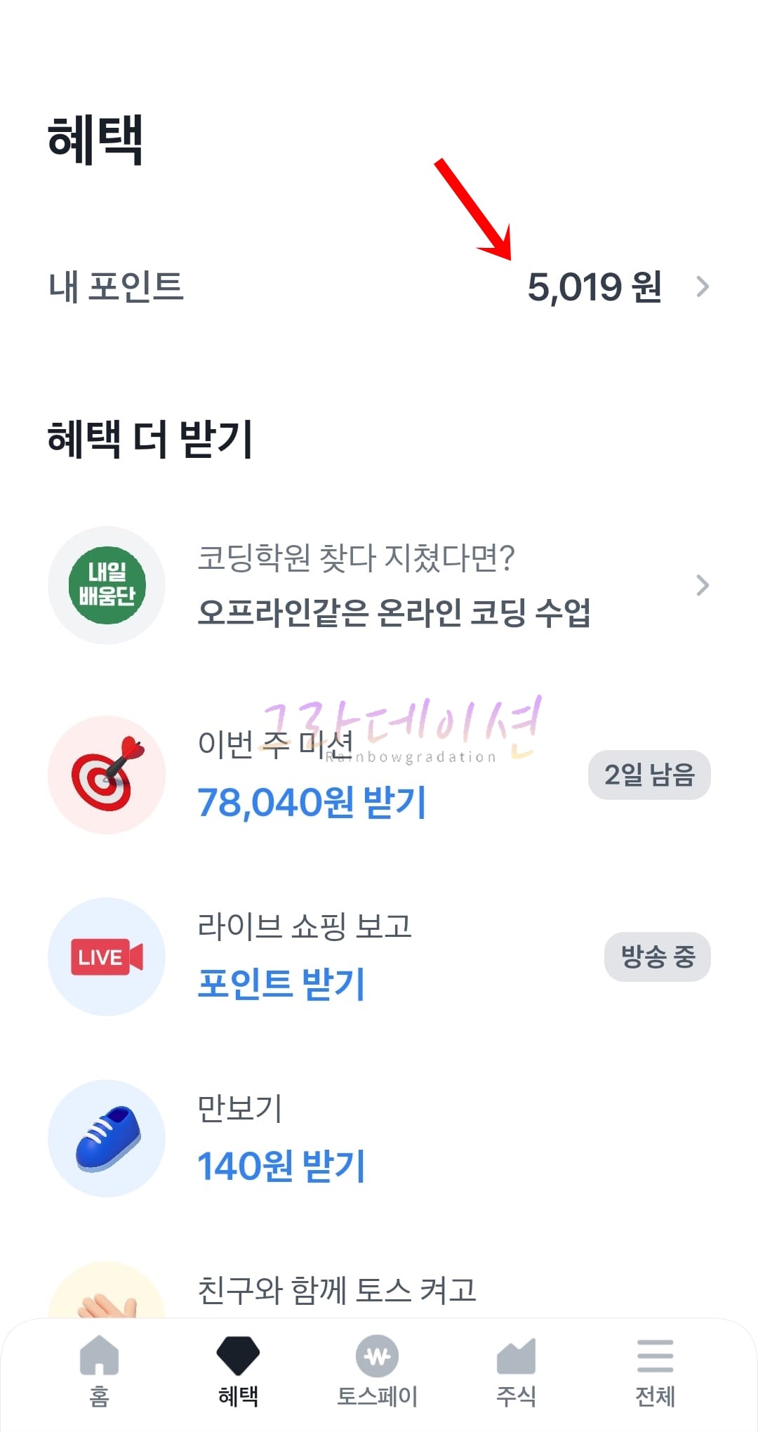 - 토스앱 최신 버전이 아닌 경우, 포인트 사용이 제한될 수 있으므로 최신 버전의 토스앱을 설치하거나 업데이트 하신 후 서비스를 이용해 주시기 바랍니다.