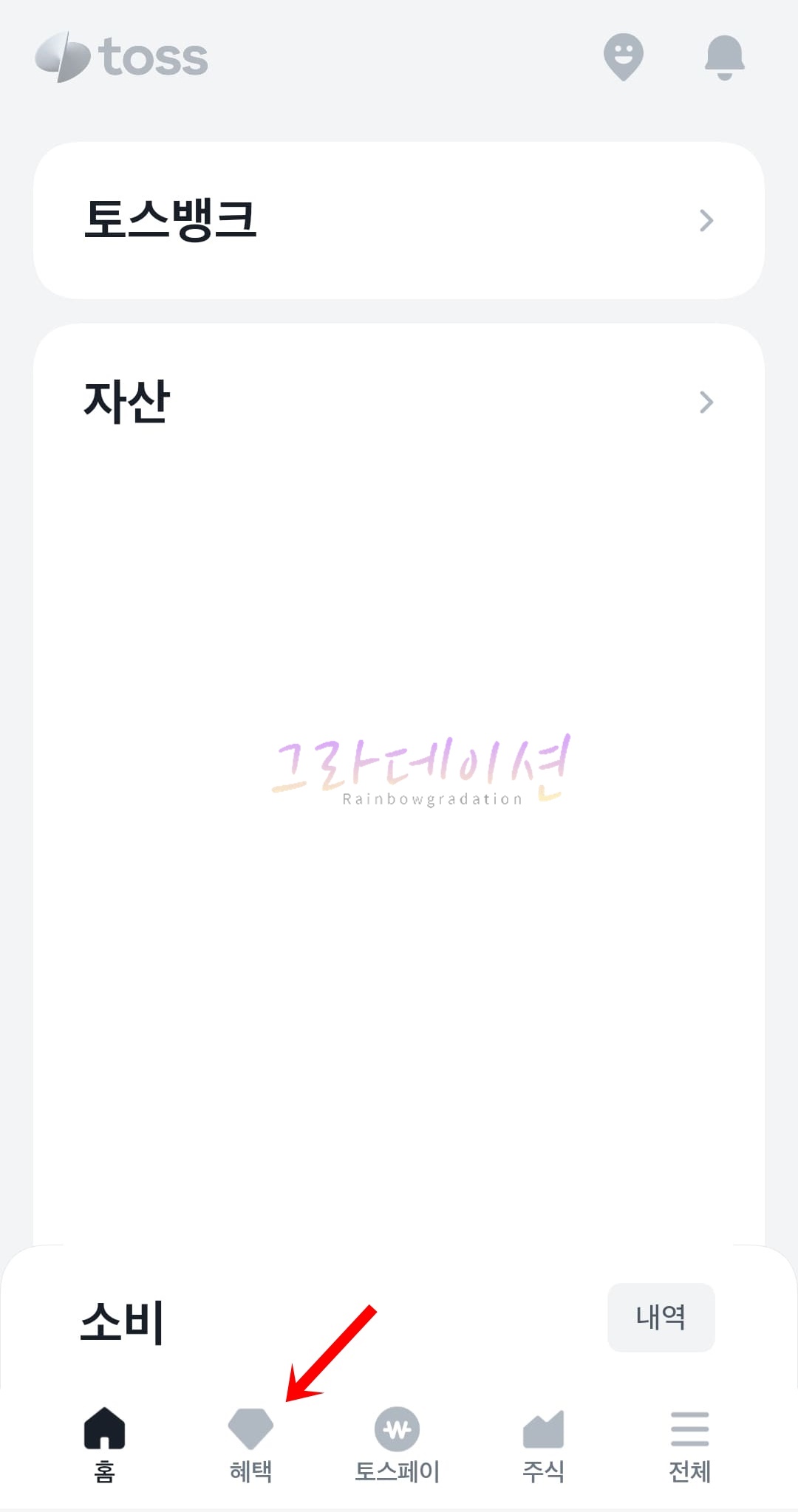 1. '토스' 앱을 실행한 후, 하단 메뉴 중 '혜택' 탭을 클릭합니다.