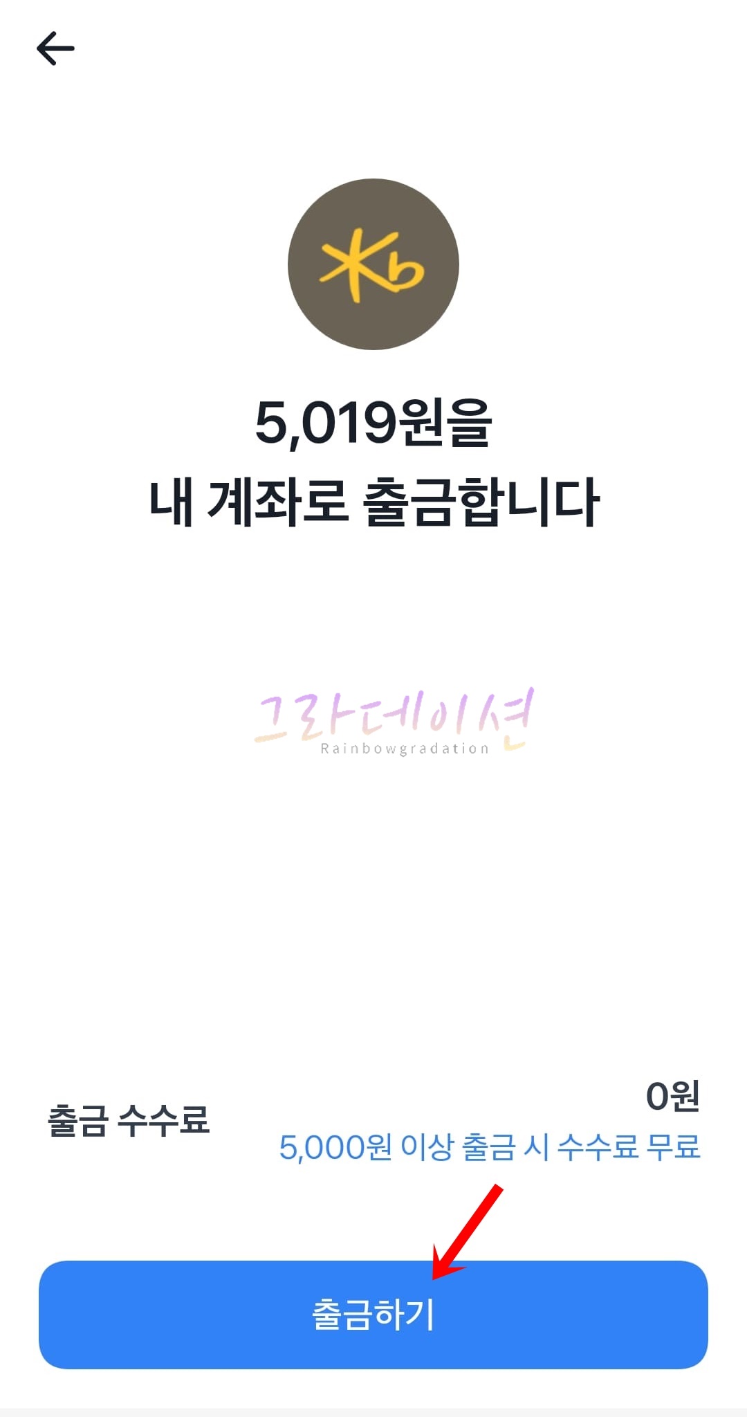 6. '출금하기' 버튼을 클릭합니다. 포인트 출금은 "주 계좌"로 입금됩니다. 그리고 토스 포인트 수수료는 5,000원 미만 출금 시, 수수료 500원 차감되고 5,000원 이상 출금 시, 수수료는 무료입니다. 따라서 포인트 출금을 하시려면 5,000원 이상부터 출금을 하시는 것을 추천드립니다.