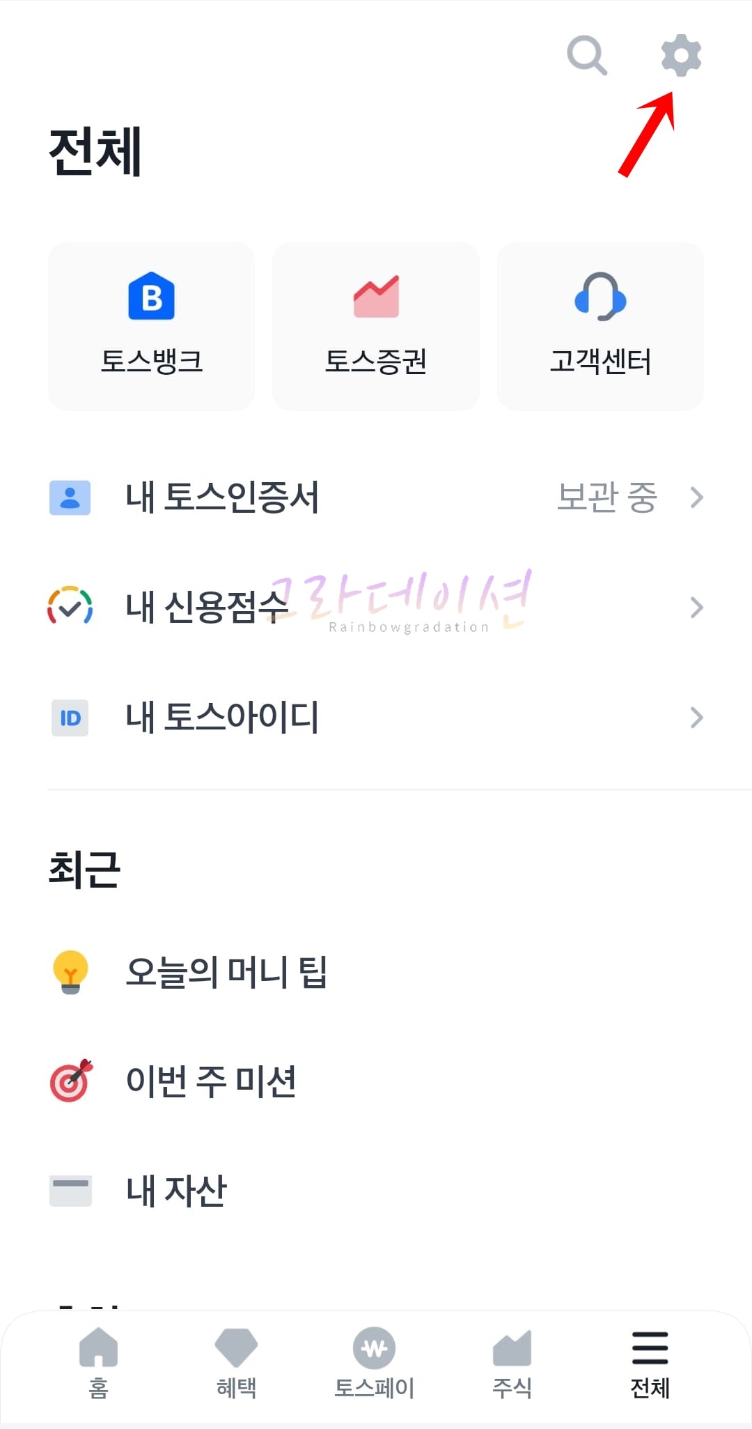 1. '토스' 앱을 실행한 후, 하단 탭 중 '전체' 탭을 클릭합니다.