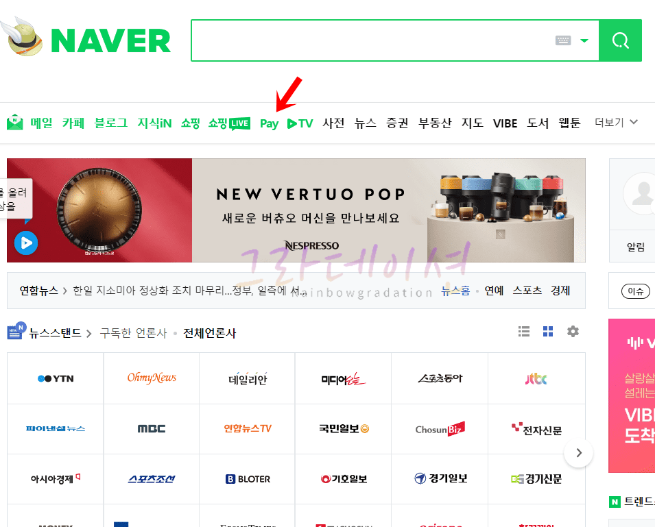 '네이버' 사이트를 실행한 후, '로그인'을 합니다. 그리고 네이버 메인 화면으로 이동하여 'Pay' 탭을 클릭합니다.