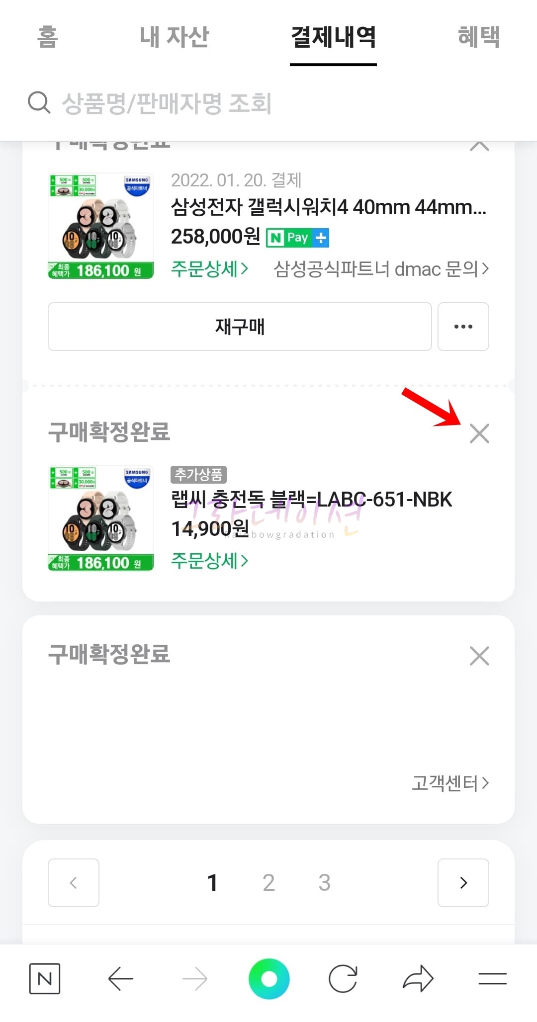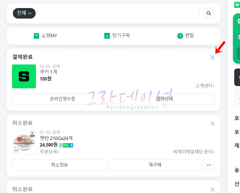 결제내역 중에서 삭제하고 싶은 내역의 'X' 버튼을 클릭합니다.