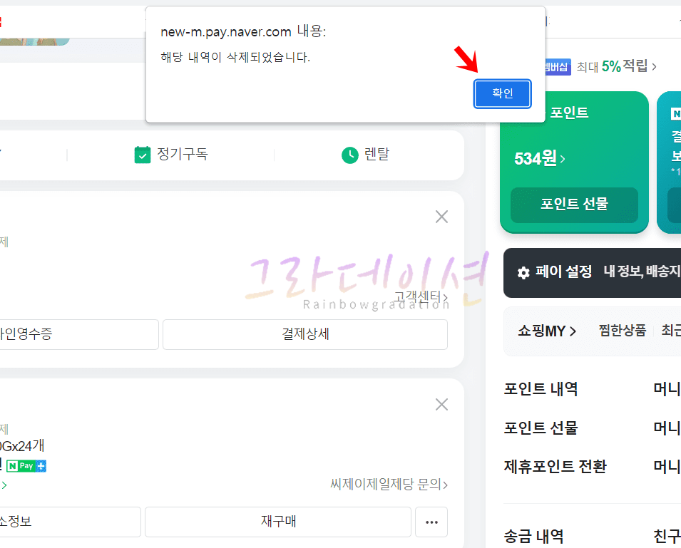 '확인' 버튼을 클릭하면 해당 내역이 삭제됩니다.